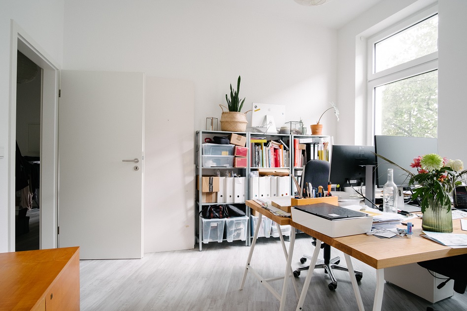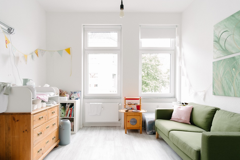 Von hier aus lassen sich alle Räume und somit das Schlafzimmer, das Wohnzimmer, das Kinderzimmer, das Büro, das Badezimmer und die Wohnküche betreten.