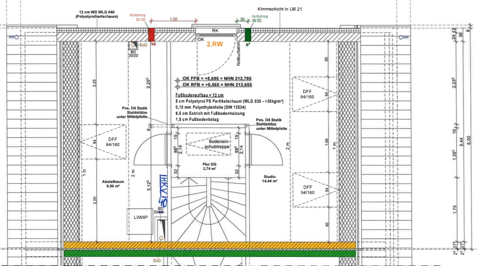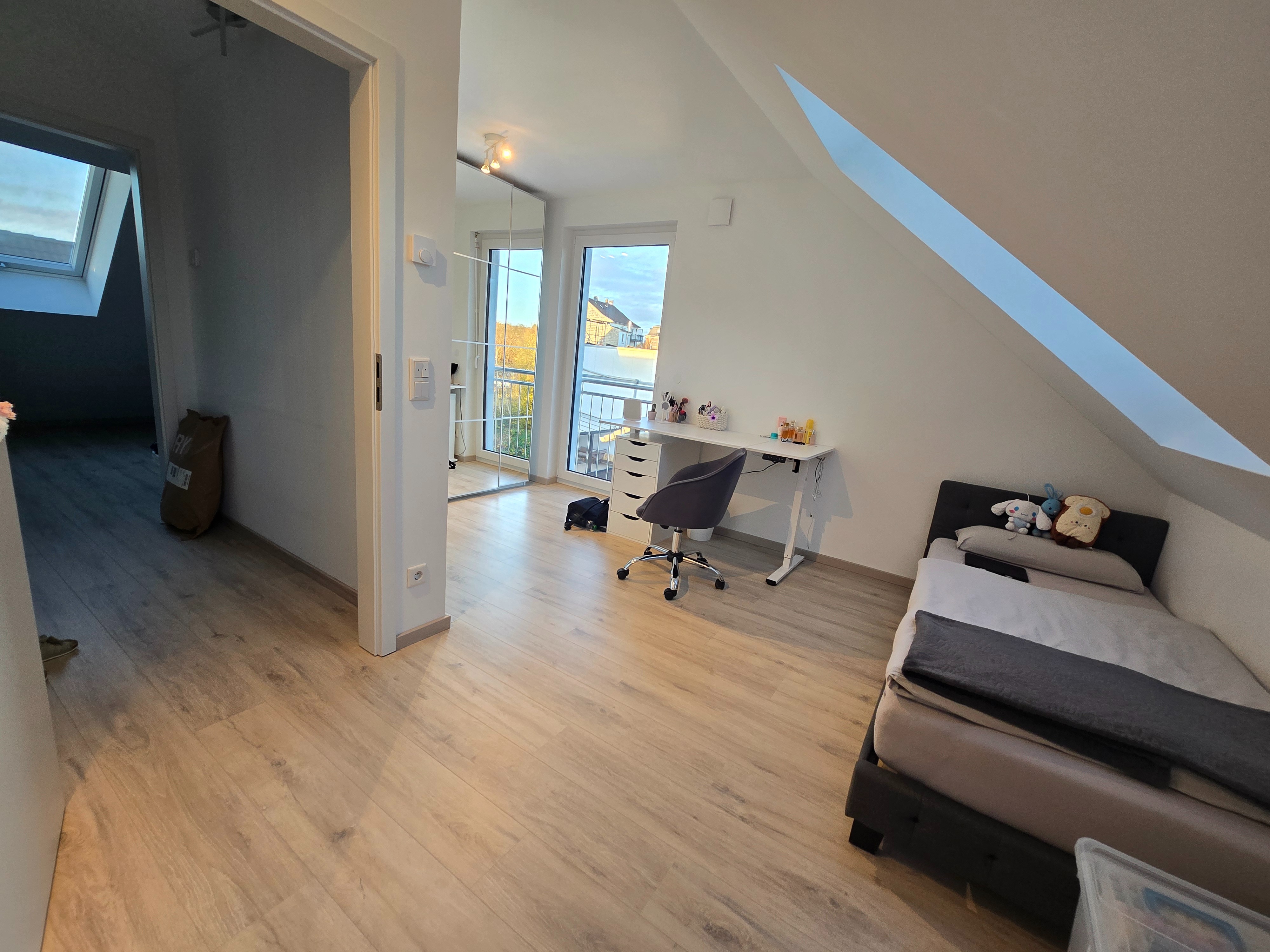 Auch im Dachgeschoss beginnen Sie in der Diele. An diese grenzen ein Büro ( mit Haustechnik / Warmwasseraufbereitung und das zweite Kinderzimmer sowie die Klappe zum Dachboden, welcher zusätzliche Staufläche bietet.