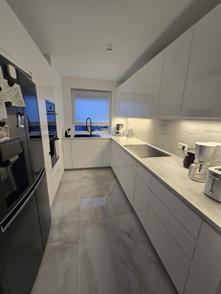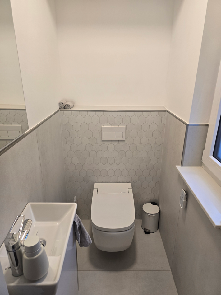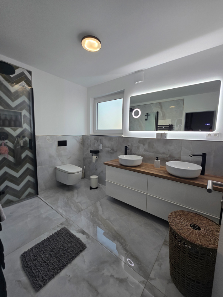 Großformatige Feinsteinzeugfliesen (1,2 m × 1,2 m) im EG und in den Bädern