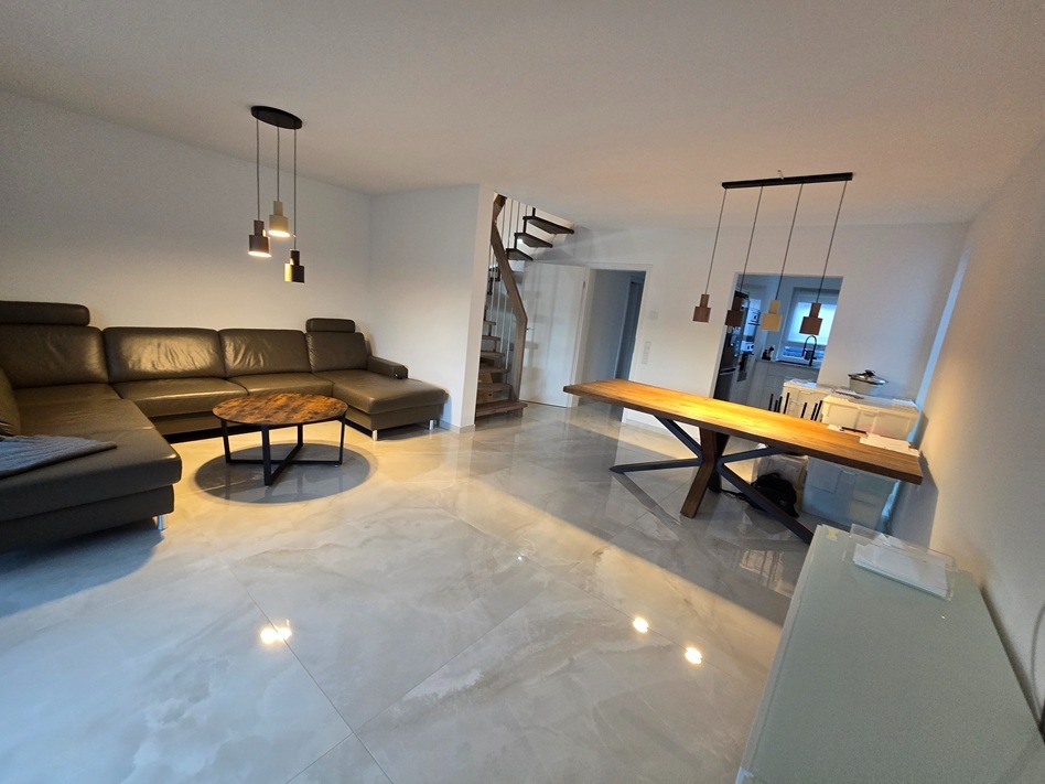 Über den Wohn-Essbereich gelangen Sie in die Küche, auf die überdachte Terrasse und in das erste Obergeschoss.