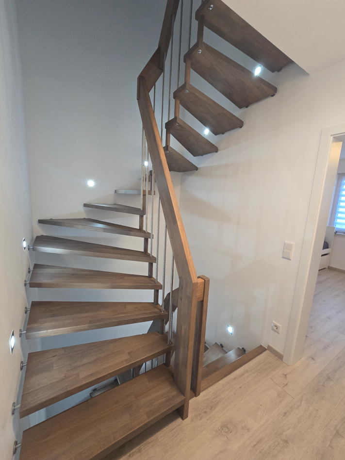 Treppenaufgang mit LED-Beleuchtung, offene Holztreppe mit Edelstahlgeländer