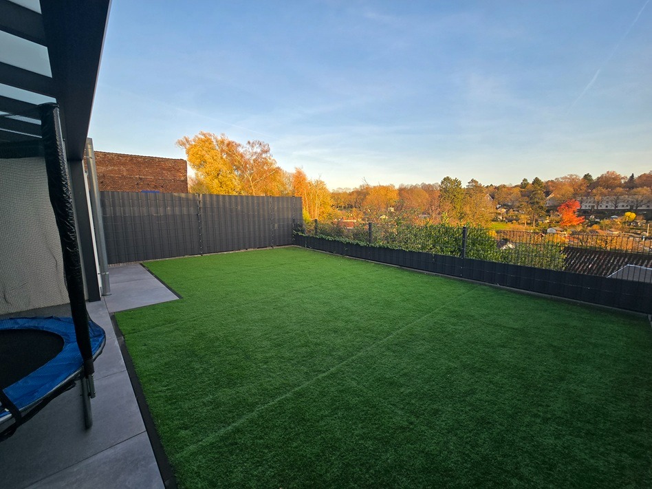 Hochwertiger Kunstrasen im Garten, kein Mähen notwendig