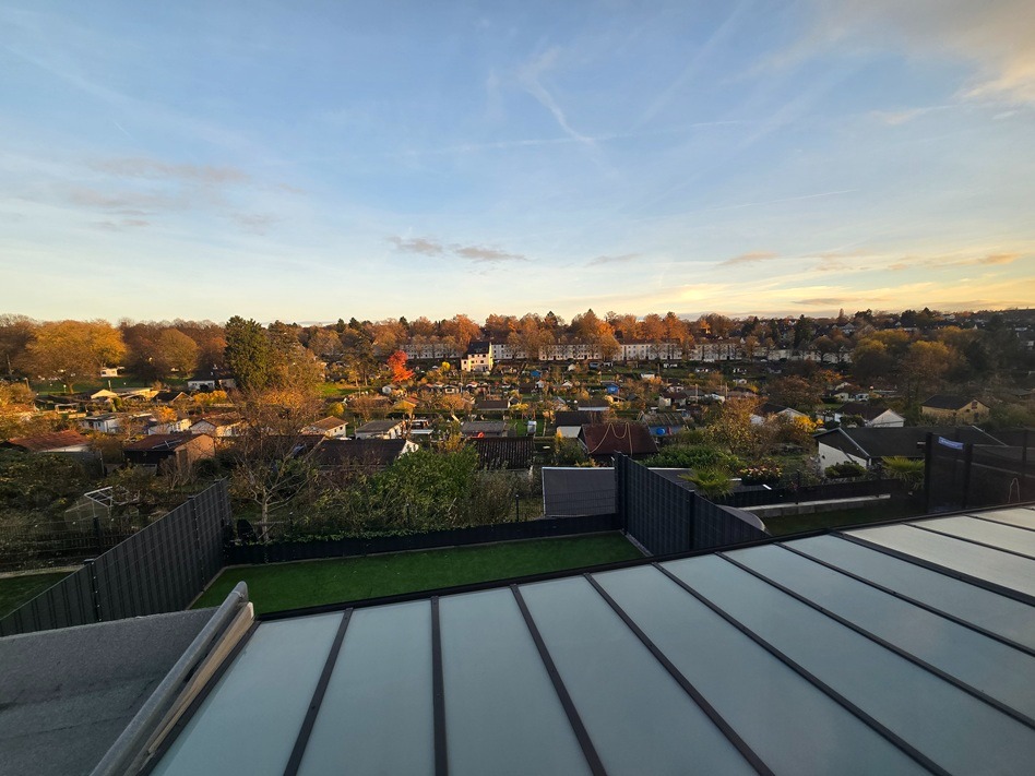 Terrasse (6 m × 3,5 m) mit Glasüberdachung, verlegt mit Feinsteinplatten