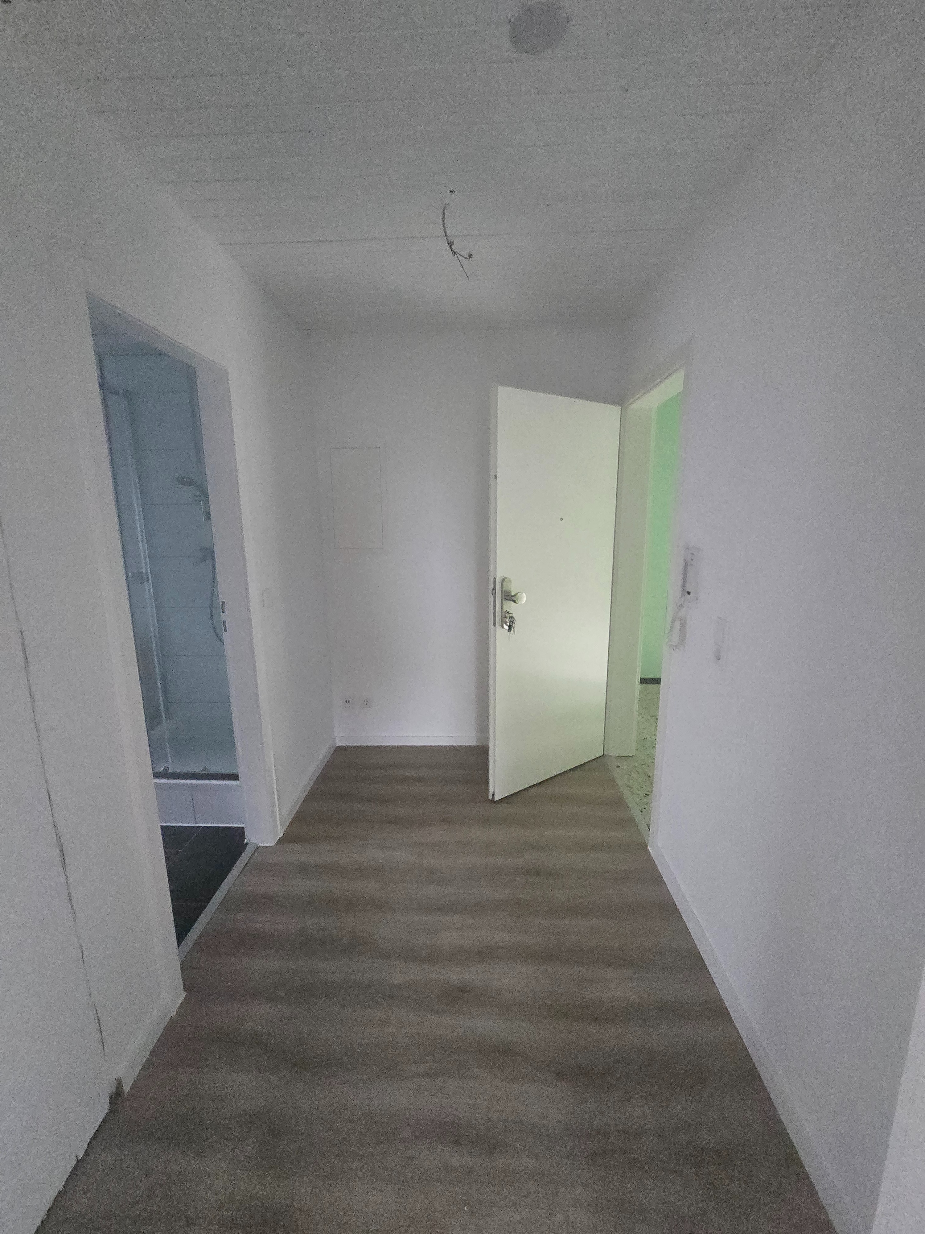 Von hier aus gelangen Sie in das Duschbad und in den geräumigen Wohn-Essbereich.