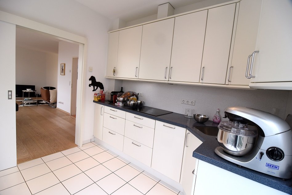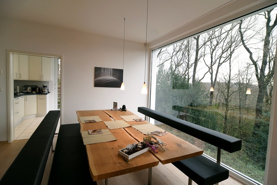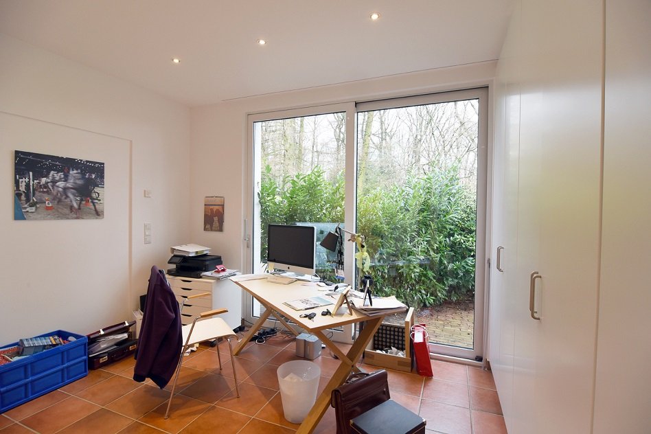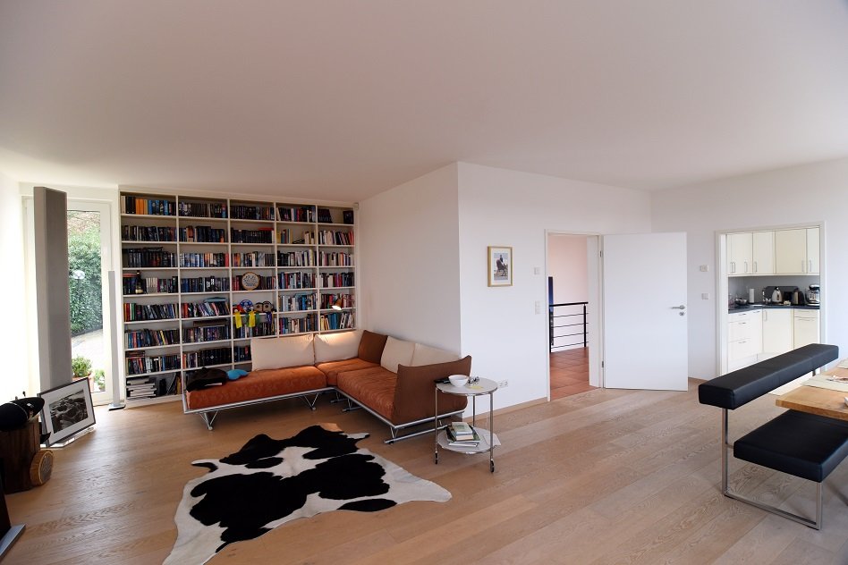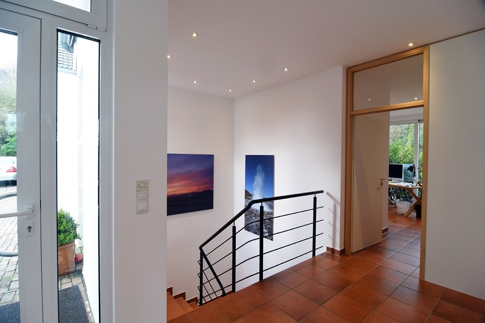 Sie betreten das Haus und stehen in der Diele. Von hier aus lassen sich das große Wohnzimmer, das Büro/Gästezimmer und die Treppe zum Untergeschoss betreten. An das Wohnzimmer grenzt die Küche. Die Einbauküche ist bereits inklusive. Zudem gehört zum Büro/Gästezimmer noch ein Gäste-WC.