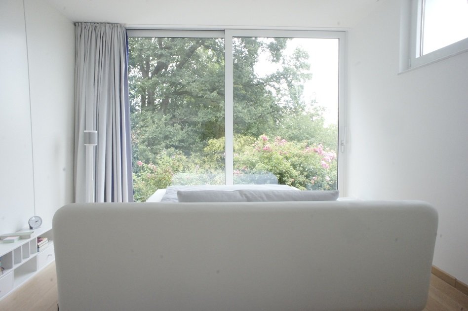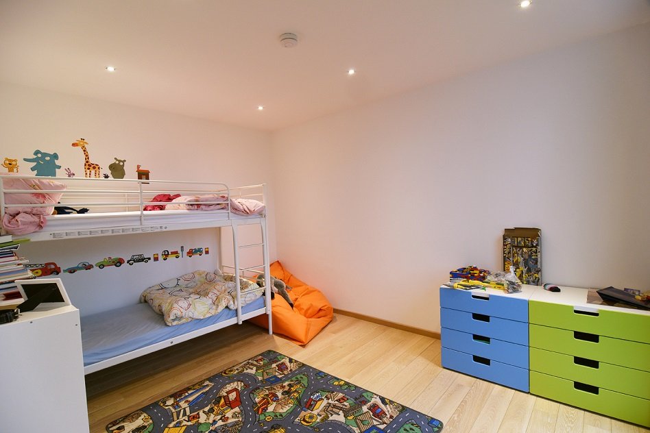 Wenn Sie das Untergeschoss erreichen, stehen Sie erneut in einer Diele. Hier befindet sich ein kleiner Abstellraum. Zudem grenzen ein innenliegendes Duschbad, das große Schlafzimmer, das Kinderzimmer und der Hauswirtschaftsraum an die Diele. Das Kinderzimmer verfügt über einen eigenen Terrassenzugang.