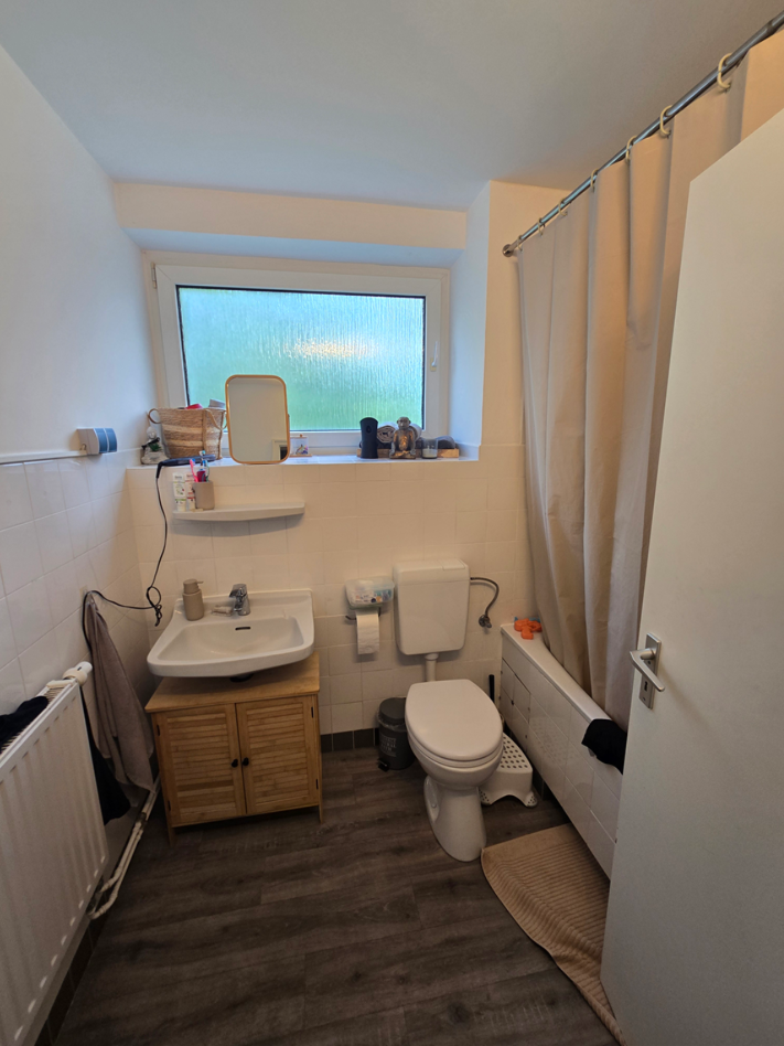 Zentralheizung über Fernwärme, Warmwasser über Durchlauferhitzer , doppelt verglaste Kunststofffenster, Laminatboden, Wannenbad gefliest mit Fenster, Balkon, Kellerraum.