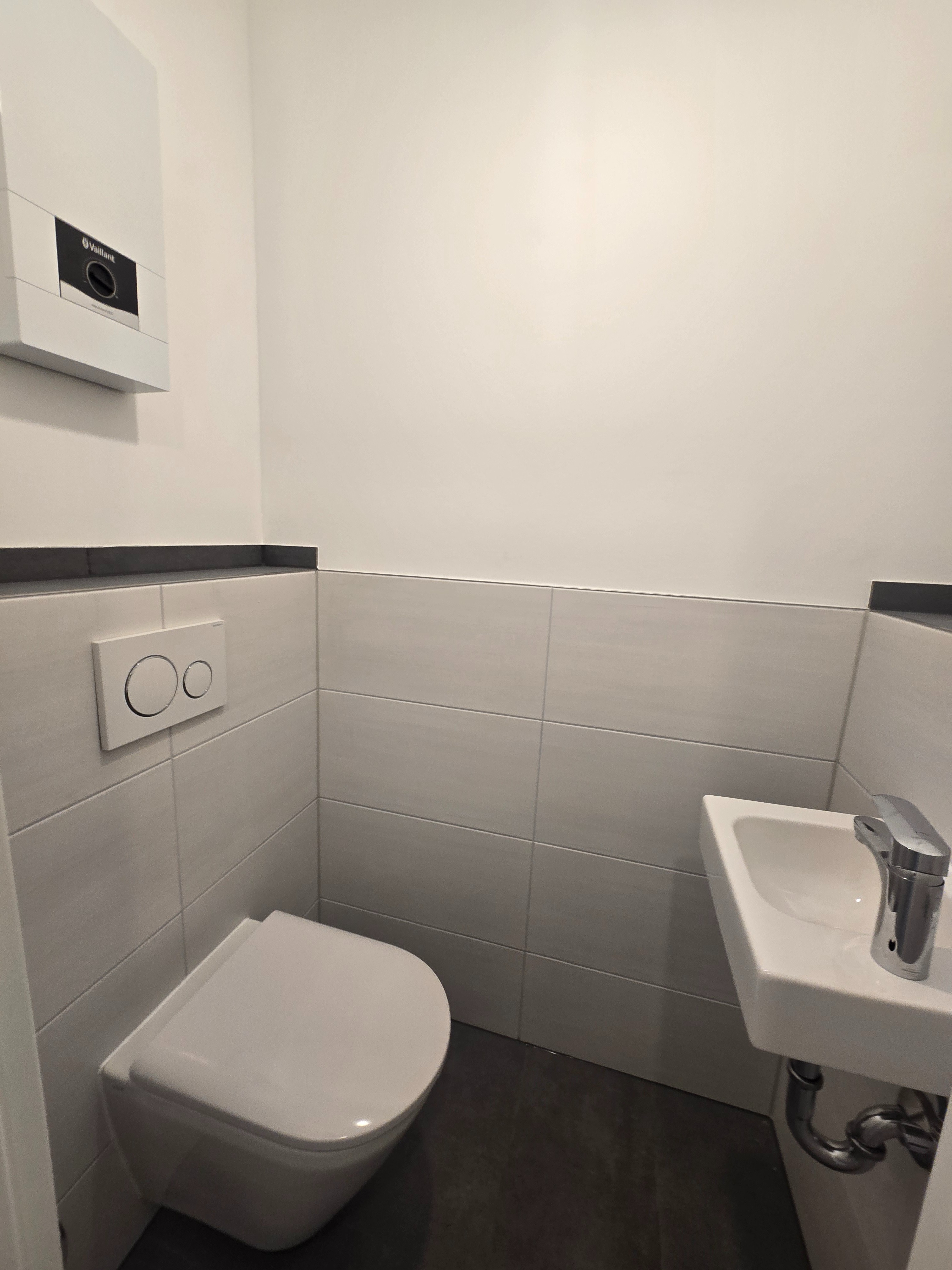 Gas-Zentralheizung, Warmwasser über Durchlauferhitzer, isolierverglaste Kunststofffenster, Gegensprechanlage, Duschbad gefliest mit Fenster, WV gefliest, Laminatboden in den Wohnräumen, der Diele und der Küche, Balkon, Wasseruhren, Keller, Waschkeller, Trockenraum.