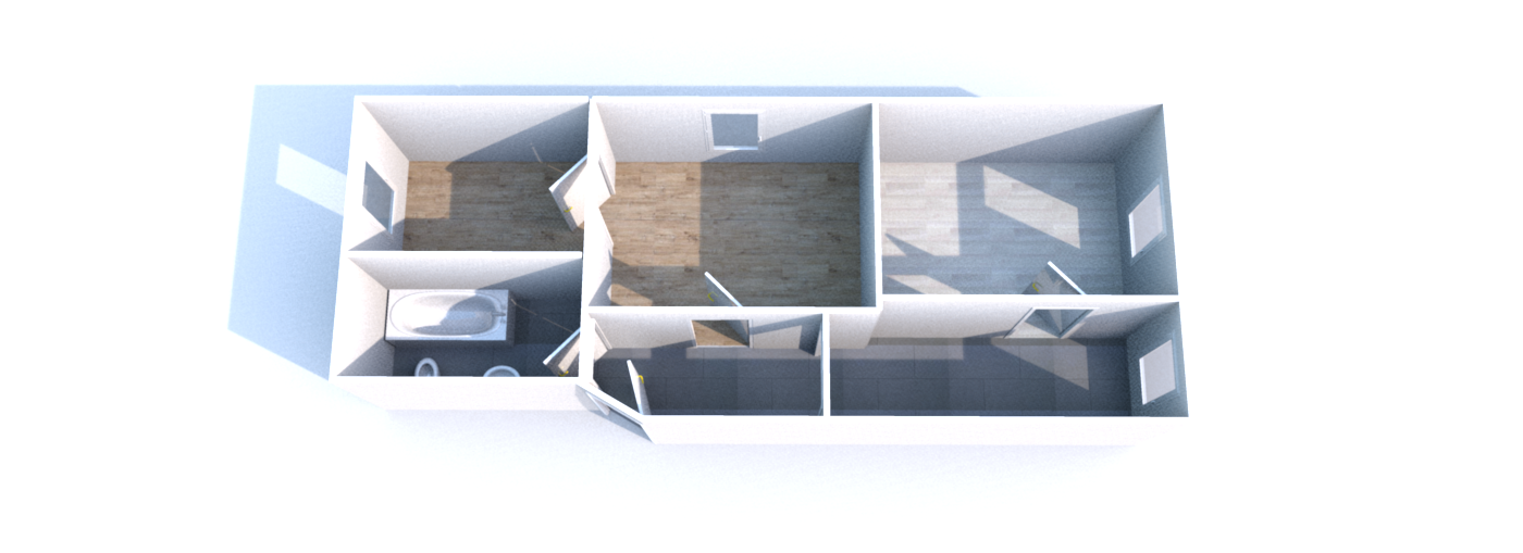 Von hier aus erreichen Sie das Badezimmer, das Wohnzimmer und die Küche.
