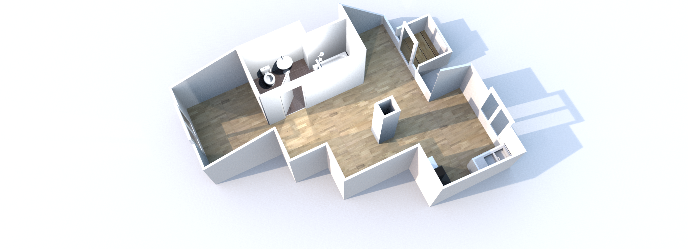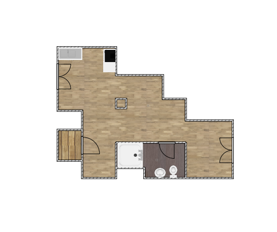Dieser ist offen gestaltet und bietet Zugang zu einem Schlafbereich, einem Küchenbereich, einem Wohnbereich und einem Badezimmer.