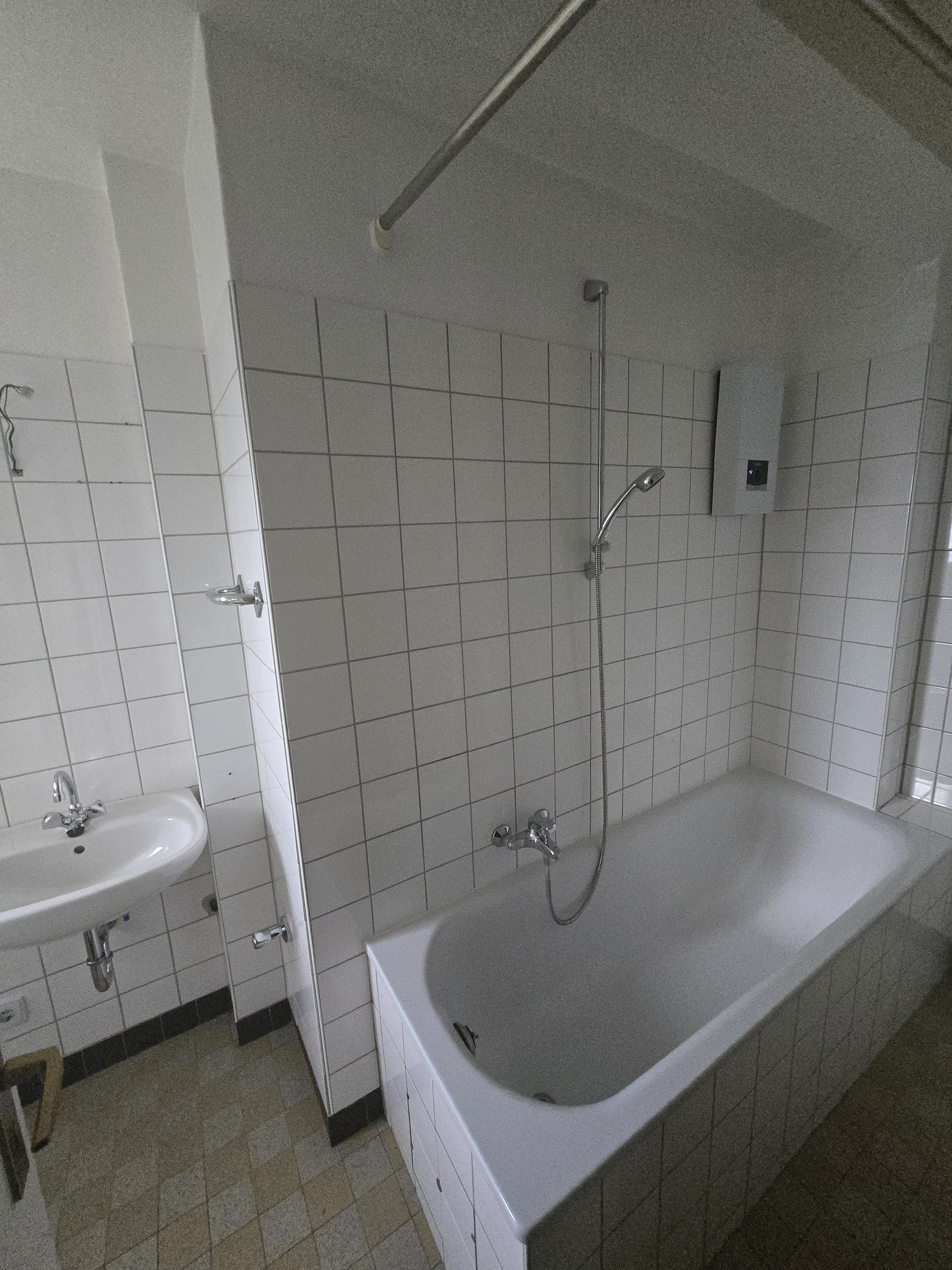 Gas-Etagenheizung, Teppichboden in den Wohnräumen, Wannenbad mit Fenster gefliest, Kellerraum.