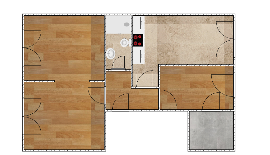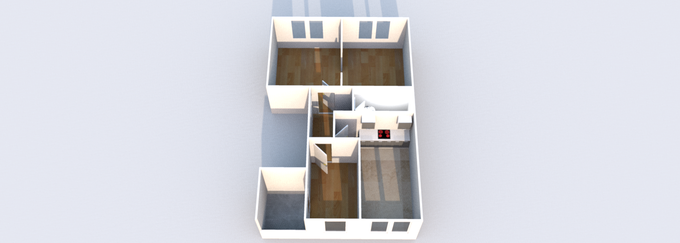 Aufteilung: Flur mit Zugang zum Wohnzimmer, zum Duschbad, zum Kinderzimmer/Büro und zur Küche.