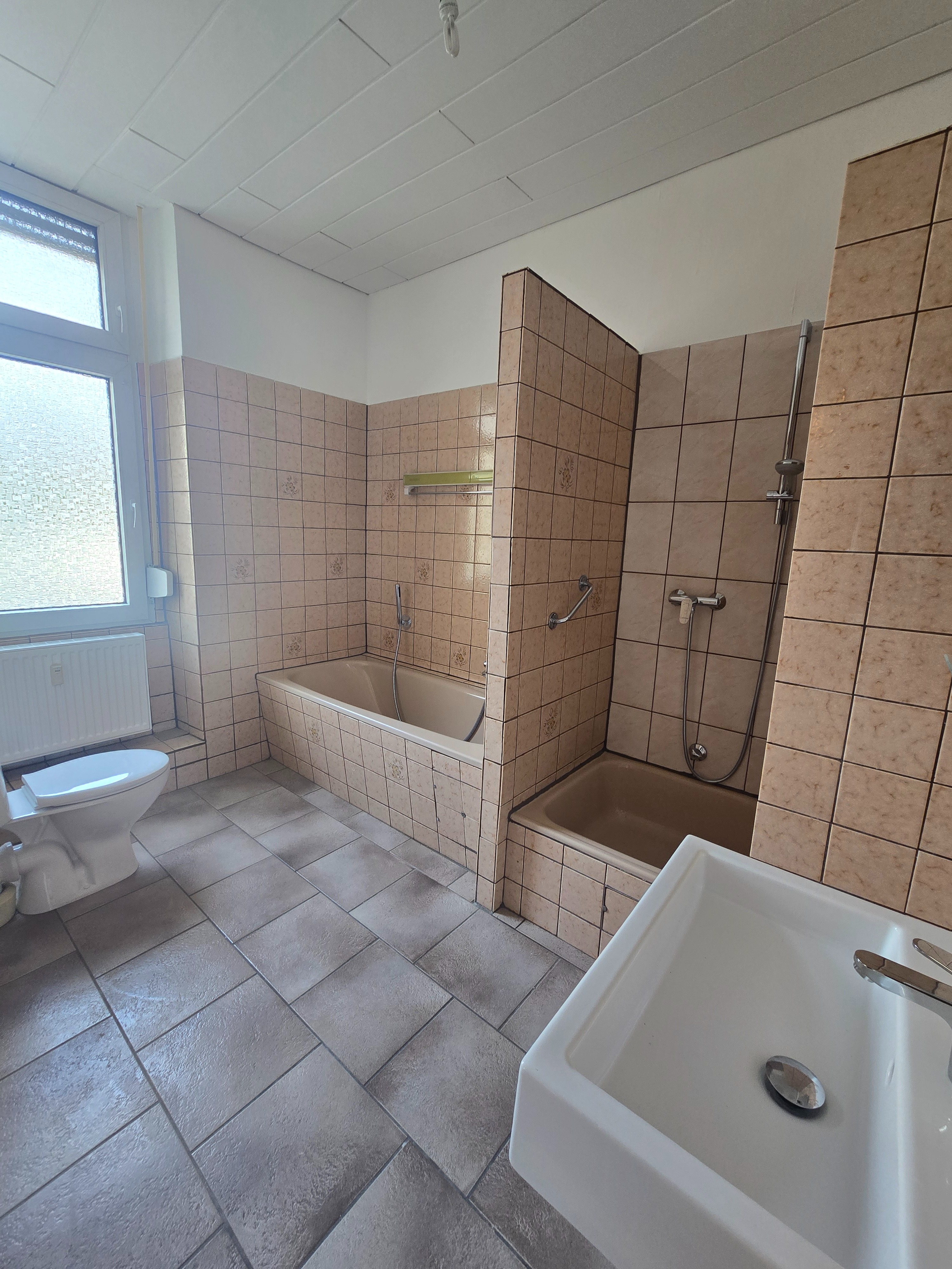 - Ausstattung des Bades Badewanne, Dusche, Fenster
