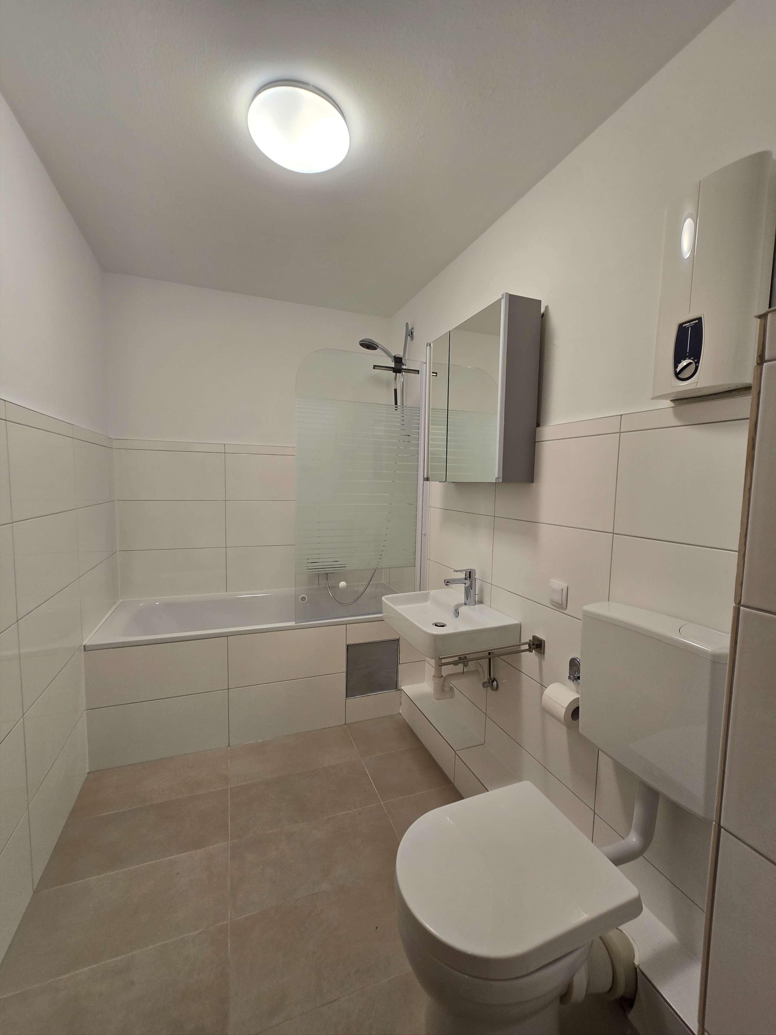 In der Wohnung stehen Sie zunächst im Eingangsbereich. Dieser führt Sie in das Badezimmer und und in den Wohnbereich.